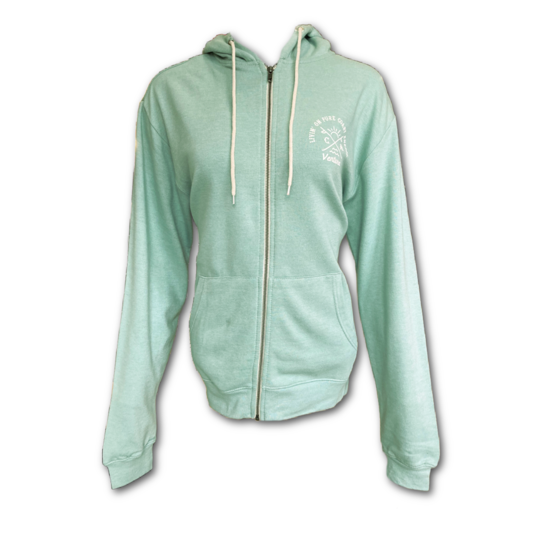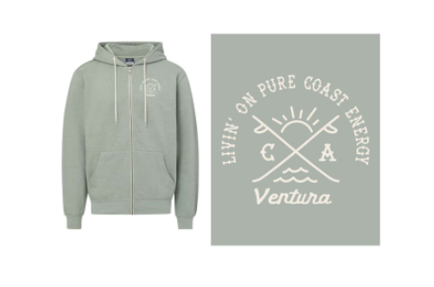 Express your love for the coast with this comfy zip hoodie showcasing a sun-and-wave graphic celebrating "Pure Coast Energy" and Ventura. Crafted in soft greenstone heather with clean white ink accents, it's an ideal layer for those who cherish beach days and positive vibes.