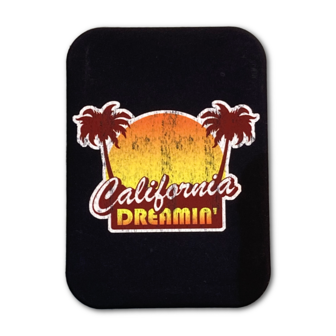 Catch those California Dreamin' vibes with this charming 2.5" x 3.5" suede magnet. Featuring a stunning golden sunset melting into silhouetted palm trees, it's the perfect way to bring West Coast warmth to your fridge, locker, or any magnetic surface. Ideal for collectors, travelers, or anyone who wants a daily reminder of sun-soaked beaches and endless blue skies. A little slice of paradise you can take anywhere.